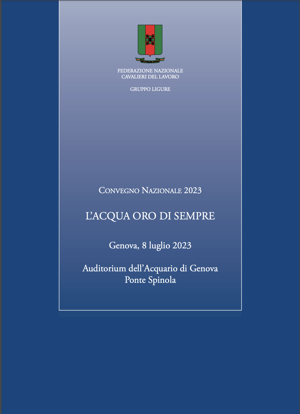 Il Cavaliere Ugo Salerno, presidente del Gruppo ligure, ha sostenuto che il ruolo del Convegno è stato quello di scambiare idee e informazioni applicando il motto “dare senza perdere, prendere senza togliere”. Il presidente della Federazione dei Cavalieri del Lavoro, Maurizio Sella, che non ha potuto essere presente al Convegno per un’indisposizione ha scritto nel suo messaggio che il Convegno di oggi è’ un’ulteriore tappa del percorso dedicato alla sostenibilità. “La competenza, la dedizione e la propensione all’innovazione che contraddistinguono i migliori imprenditori italiani, possono e debbono essere messi a fattor comune per ridurre l’impatto ambientale delle attività umane sull’acqua e per favorirne la conservazione in una logica di equità intergenerazionali”.