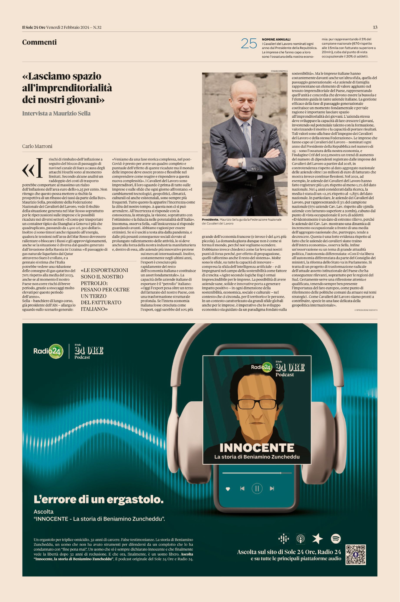 Infine un’osservazione su un tema di grande attualità politica, l’autonomia differenziata: «Con il via libera all’autonomia differenziata da parte del Consiglio dei ministri, la riforma dello Stato va in Parlamento. Si tratta di un progetto di trasformazione radicale dell’attuale assetto istituzionale del Paese che ha conseguenze rilevanti, soprattutto per le regioni del Sud. Certamente serve una riflessione attenta e qualificata, tenendo sempre ben presente l’importanza del faro europeo, come punto di riferimento delle politiche comuni da attuare sui temi strategici . Come Cavalieri del Lavoro siamo pronti a contribuire, specie in una fase delicata della geopolitica internazionale».