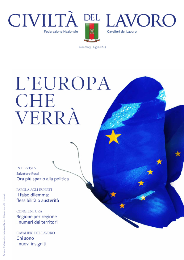 Copertina del n. 3/2019 di Civiltà del Lavoro: la bandiera dell’Unione europea sulle ali di una farfalla